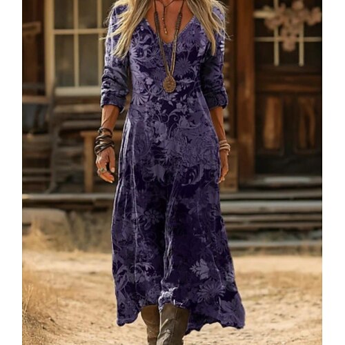 Per donna Abito lungo maxi Abito Boho Abito Vintage Vestito Casual Vintage Quotidiano All'aperto Vacanza Vestibilità comoda Floreale Manica Lunga Scollo a V Viola Primavera Autunno
