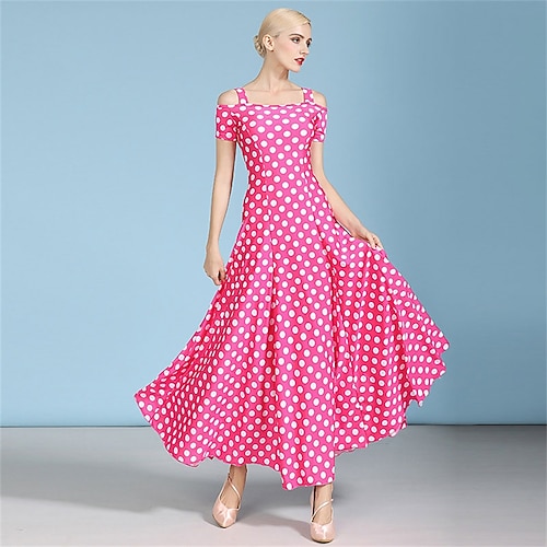 abito da ballo da sala a pois con spalle scoperte per donna - abito a trapezio per gare, latino e balli - rosa bianco