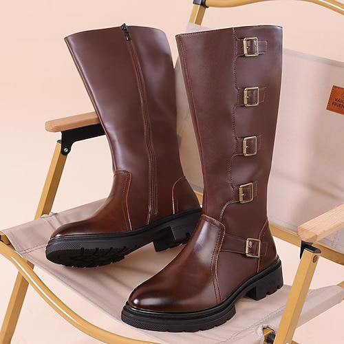 stivali da motociclista da uomo alti fino al ginocchio robuste scarpe invernali da equitazione in pelle nera con fibbie