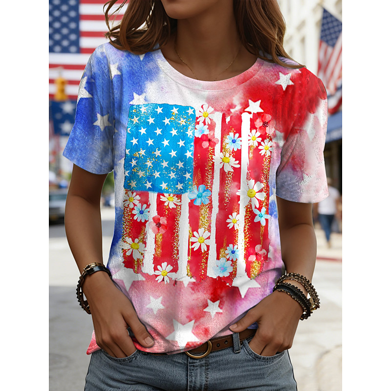 American Independence Day Women's T Shirt Graphic Letter American Flag Vintage Stylish Casual Short Sleeve Crew Neck Regular Tops Daily Weekend Print Blue Pink Red Summer Spring