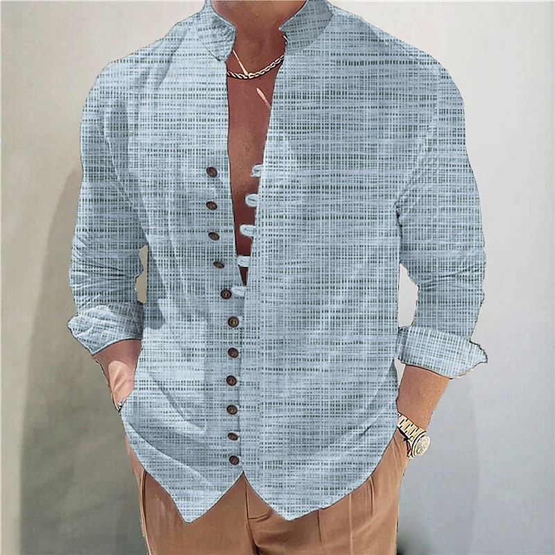 Men's Geometric Line Shirt Stand Collar Shirt Long Sleeve Casual Vacation Daily Wear Going out Spring Fall Mandarin Collar Band Collar Button-Down Linen Like Shirt Blue Light Purple Green Khaki
