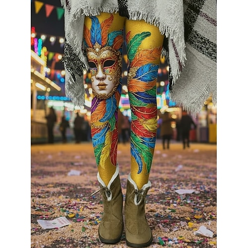 Karnevals-Leggings für Damen, bequeme Leggings im Vintage- und Ethno-Stil, lange Hose mit hohem Bund, Grafikprint, bequem, dehnbar, lässig, für den Alltag, gelb, lila, fuchsia, orange