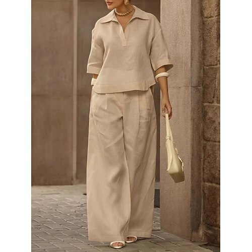 Per donna Camicia Set di biancheria in cotone Set da due pezzi Pantaloni di Lino Pantaloni Manica Lunga Colletto a Camicia Tinta unica Coulisse Moda Streetwear Abbigliamento quotidiano Data Bianco
