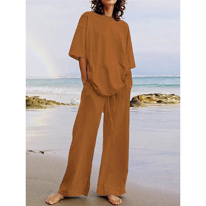 Women's Cotton Linen Sets Two Piece Sets Basic Pure Color Pocket Elastic Waist T Shirt Pant Street Daily Long Sleeve Crew Neck Black White Navy Blue Light Brown Blue Summer Spring