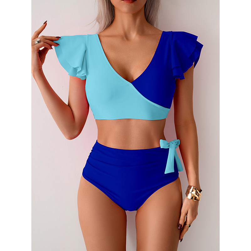 Women's Bikini 2 Piece Swimsuit Colorblock Briefs Slim Backless Vacation Beach Wear Color Block V Neck Sleeveless Short Sleeves Bathing Suits