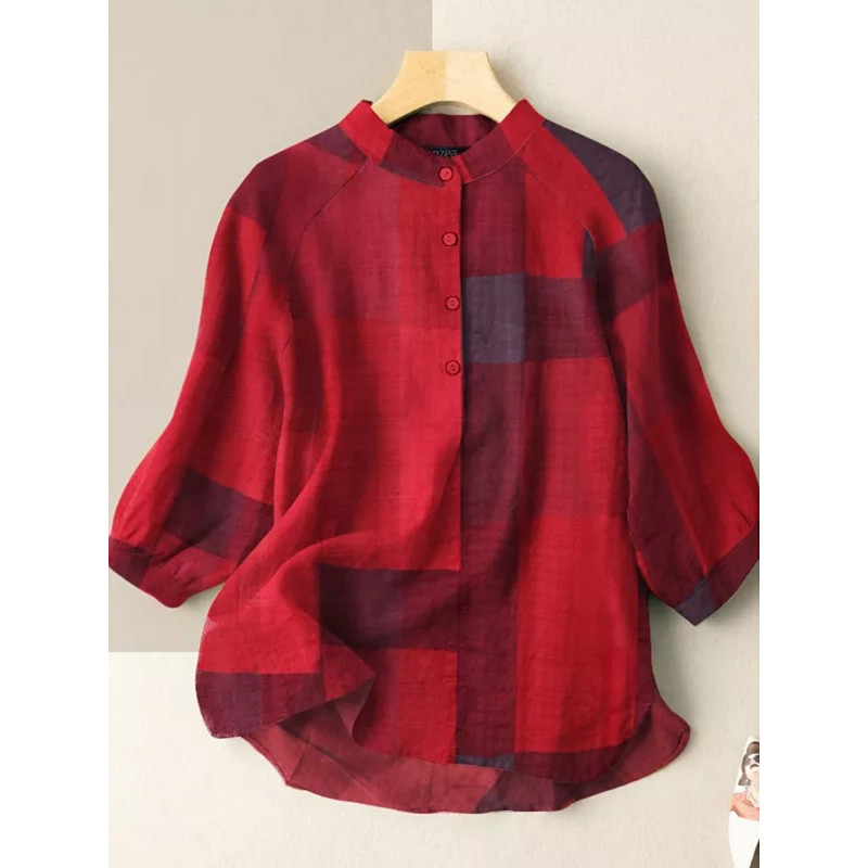 Women's Cotton Linen Shirts Plaid Vintage Basic Casual Long Sleeve High Neck Regular Tops Daily Buttons Print Blue Red Khaki Summer Spring Fall