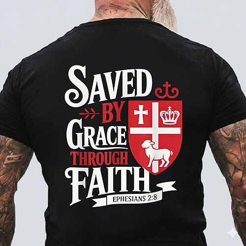 Männer-T-Shirt mit rotem Schild, Kreuz, Krone und Lammmotiv (Epheser 2,8). Christliches Design, Kurzarm, normale Passform, für den Alltag. Größen: S, M, L, XL, XXL, XXXL.