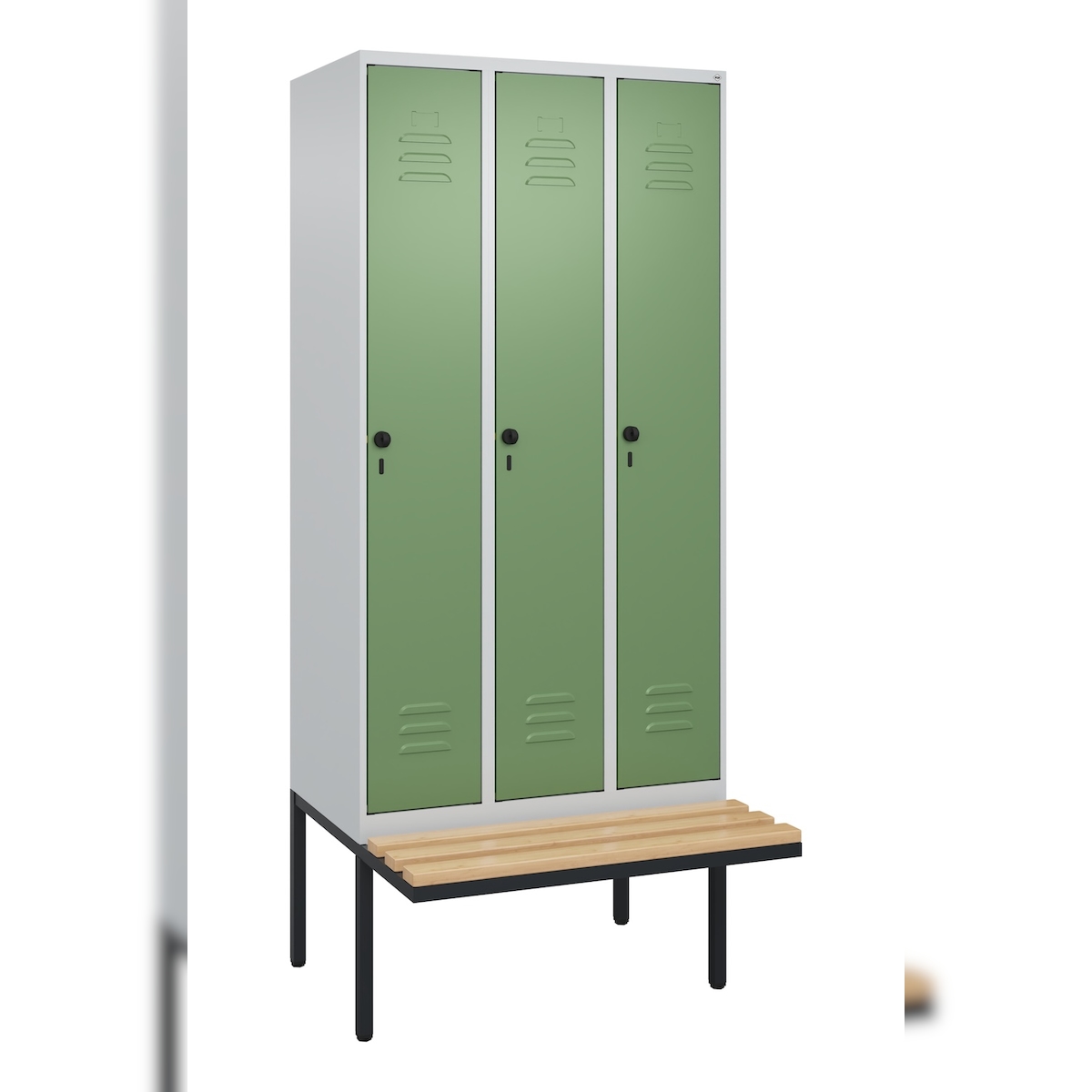C+P Spind Classic PLUS, schwebender Sitzbank aus Buche 3 Abteile, HxBxT 212x90x82cm, Sicherheitsdrehriegel, Hellgrau/Resedagrün von PROREGAL