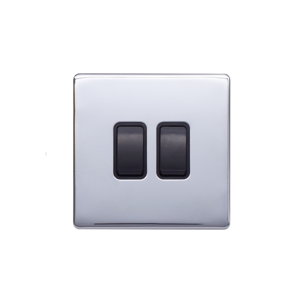 Lieber Polished Chrome 10A 2 Gang 2 Way Switch - Black Insert Screwless - Size: 86mm x 86mm x 2 mm
