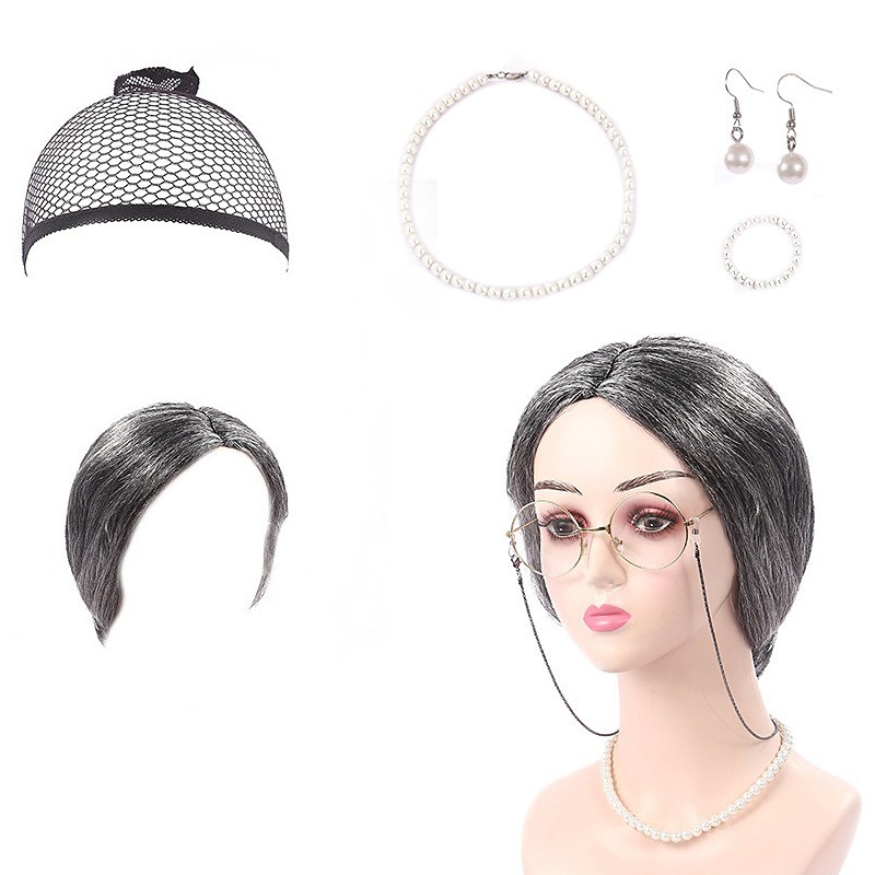 Old Lady Wig with Pearl Necklace Earrings Set for Women Girls Grandma Cosplay 100 Days of School Costume Halloween Party Accessories