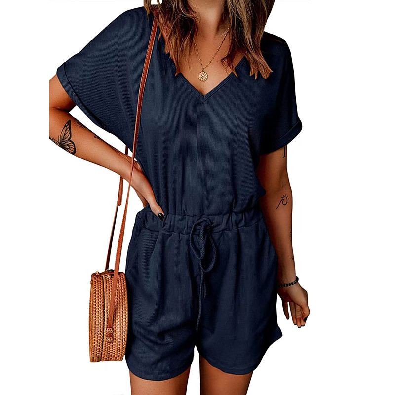 Women's Normal Romper Active Solid Color Short Sleeve Baggy Shorts V Neck Pocket Belted Daily Vacation Regular Fit Wine Navy Blue Purple Summer