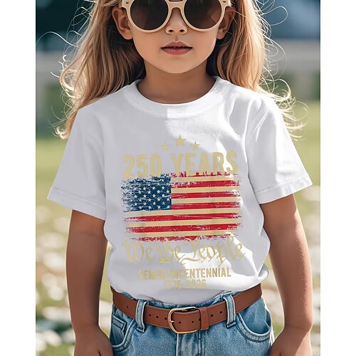 100% Cotone Bambini Ragazze Nero Bianco Grafico Bandiera USA 250° anniversario Bandiera americana per bambini Maglietta Girocollo Manica Corta Vacanza Sport Outdoor Abbigliamento Quotidiano Vacanza