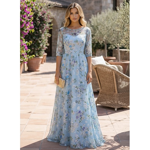 Linea ad A Abito Lunghezza al pavimento Vestito da Festa Abito da Cocktail Abito da cerimonia per signora Mezza Manica Scollo Illusione Elegante Vintage Formale Ospite di nozze Festa di fidanzamento