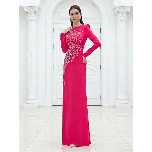 Abito Formale Floor Length Sheath Column Abito da Sera Abito da Sera Elegante Vintage Maniche Lunghe Collo a Giro Sera Festa Matrimonio con Cristalli di Strass e Perline