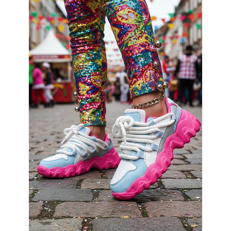 Damen Mardi Gras Rosarote chunky Plateau Sneakers mit Metallic Gold – Retro Dad Schuhe für Karnevalspartys Streetwear Rave-Outfits