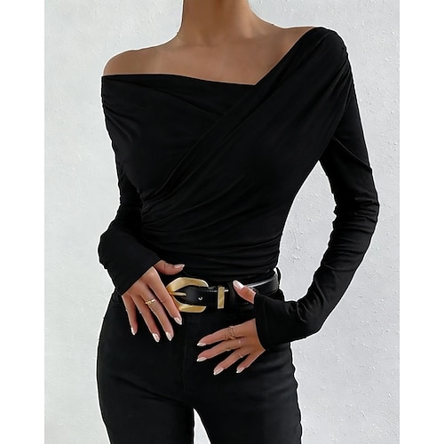 Per donna Blusa Semplice Elegante Casual Manica Lunga Monospalla Top Regolari Quotidiano Uscire Weekend Patchwork Nero Bianco Vino Primavera Autunno