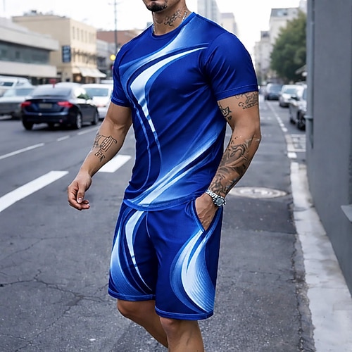 Herren Geometrisch Linie 2St T-Shirts-Sets Sommeroberteile Kurzarm Kurze Hosen Rundhalsausschnitt Sport Lässig Täglich Urlaub Ausgehen 3D-Druck Sommer Blau Schwarz Rote