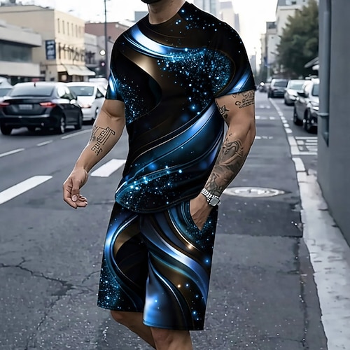 Herren Galaxie 2St T-Shirts-Sets Sommeroberteile Kurzarm Kurze Hosen Rundhalsausschnitt Sport Lässig Trendy Täglich Urlaub Ausgehen 3D-Druck Sommer Blau Rote Purpur