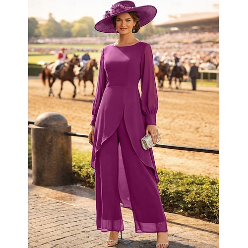 Completo Pantalone Lunghezza al pavimento Abito da cerimonia per signora Manica Lunga Collo gioiello Elegante Semplice Ospite di nozze Serata Formale Ricevimento di matrimonio Chiffon con Tinta unita