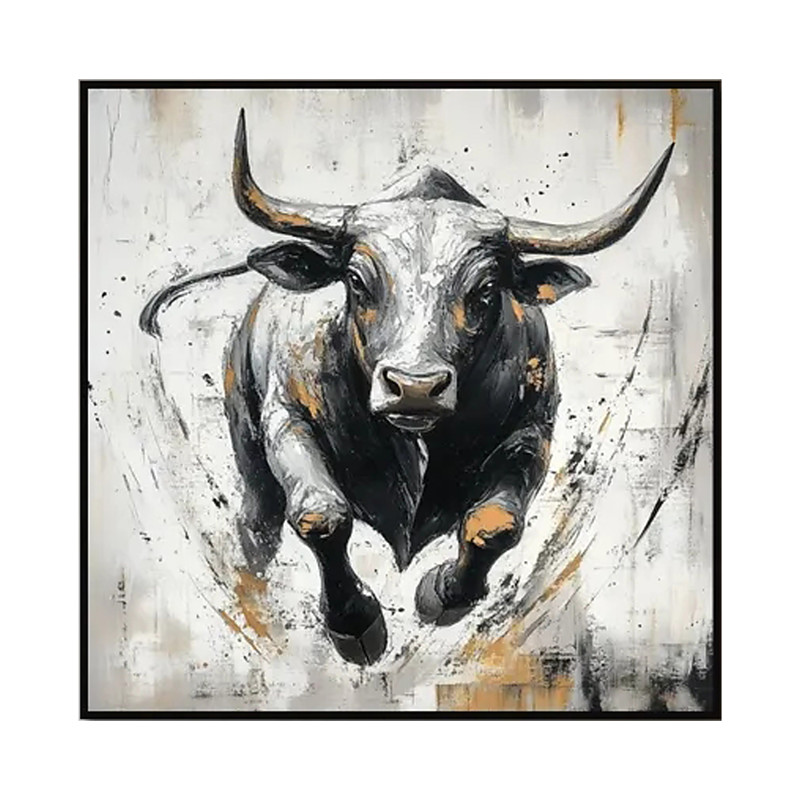 Handmade Oil Painting Acrylic Canvas Wall Art Decoration Animal Oil Painting Black-and-White Running Bull for Home Office Hotel Club Decor Rolled Frameless Unstretched Painting