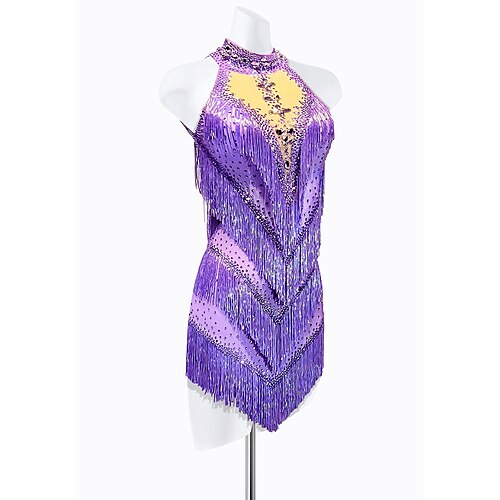 viola abbagliante abito da ballo latino dorato per donna - scollo all'americana con strass, frange sfumate abito da tango rumba salsa con orlo asimmetrico