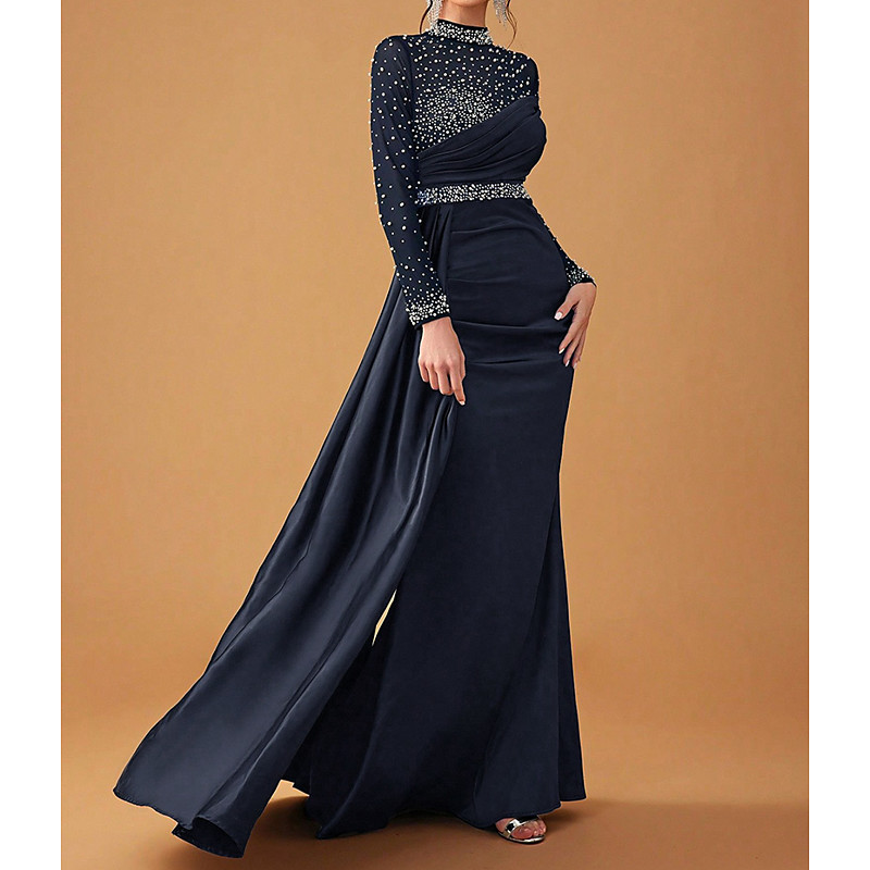 Mermaid Trumpet Floor Length Evening Gown Ball Gown with Overskirt Formal Dress Elegant Glittering Celebrity Style Long Sleeve High Neck Garden Party Wedding Stretch Satin with Pearls Crystals