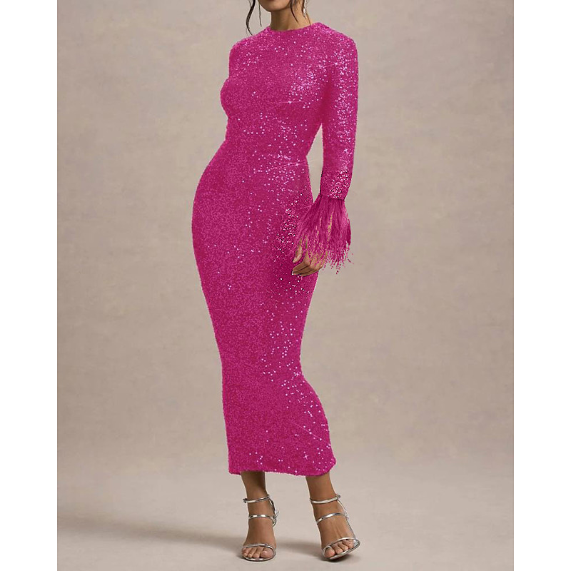 Mermaid Trumpet Floor Length Prom Dresses Evening Gown Ball Gown Formal Dress Elegant Glittering Celebrity Style Long Sleeve Crew Neck Garden Party Wedding Sequined with Feather