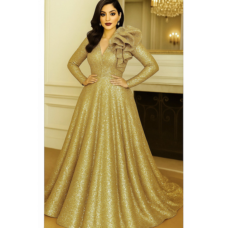 A-Line Floor Length Evening Gown Ball Gown Elegant Glittering Sparkle Long Sleeve V Neck Wedding Formal Pocket Sequined with Glitter