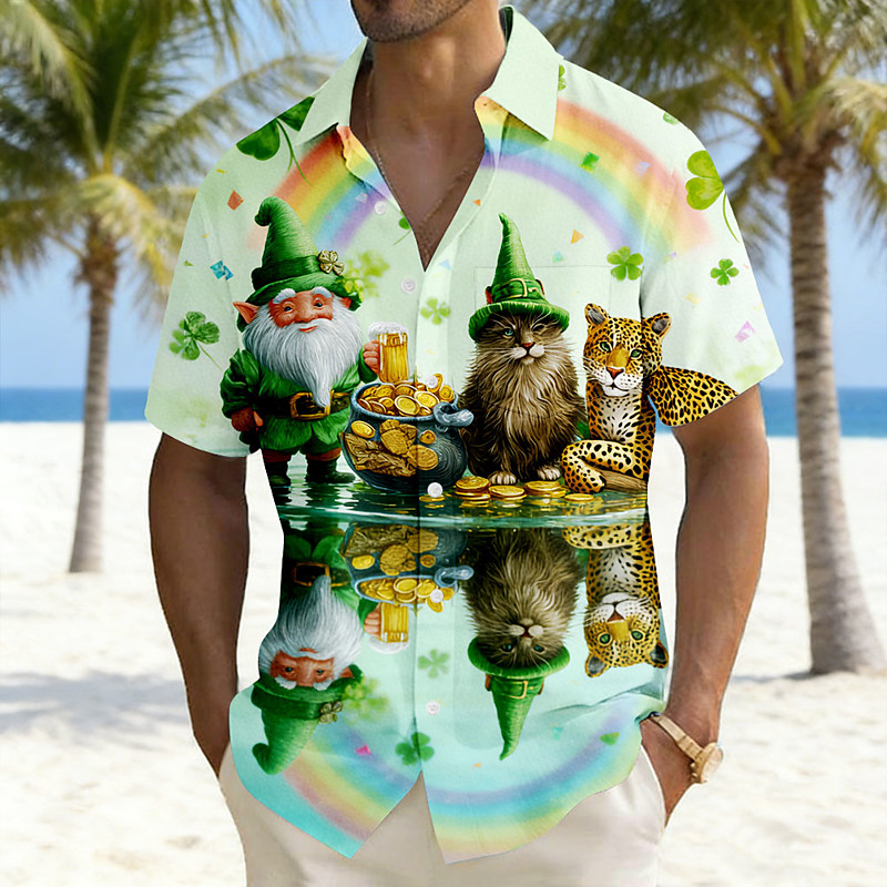 St. Patrick's Day Men's Shamrock Leprechaun A pot of gold Shirt Summer Shirt Button Up Shirt Short Sleeve Vintage Retro Holiday Summer Turndown 3D Print Front One Pocket Linen Like Shirt Light Green