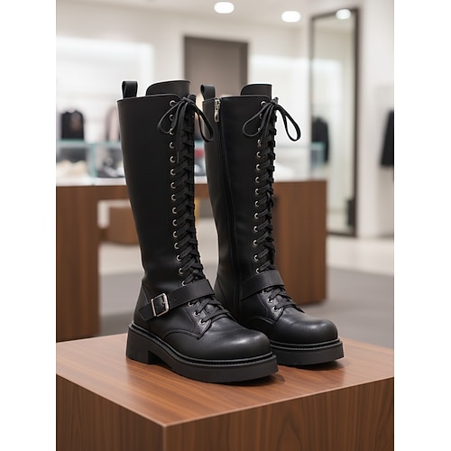 stivali neri da donna con lacci alti fino al ginocchio, suola spessa e cinturino - eleganti e resistenti per la moda casual o da strada