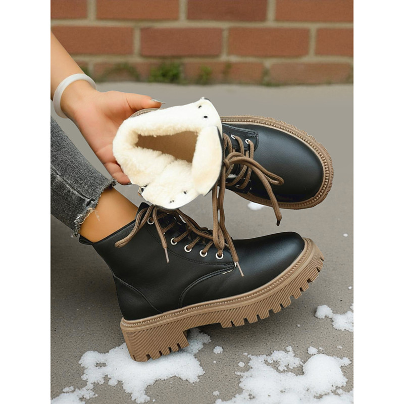 Women's Black Chunky Heel Lace-Up Boots with Faux Fur Trim – Trendy, Warm and Comfortable, Great for Casual Winter Outfits, Outdoor Activities