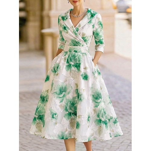 Linea ad A Lunghezza Tè Vestito da Festa Abito da Cocktail Abito da invitata a nozze Abito da cerimonia per signora Manica 3/4 Scollo a V Colletto a Camicia Elegante Vintage Formale Organza Jacquard