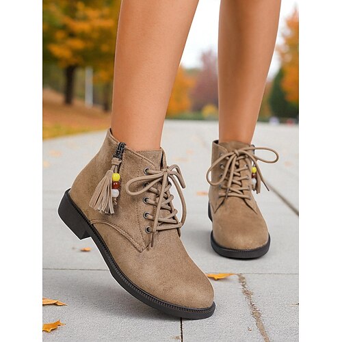 stivaletti alla caviglia da donna con lacci marrone scuro, cerniera laterale e dettaglio con nappe perline, comodi stivali in finta pelle scamosciata con tacco basso, stile nomade cittadino, per