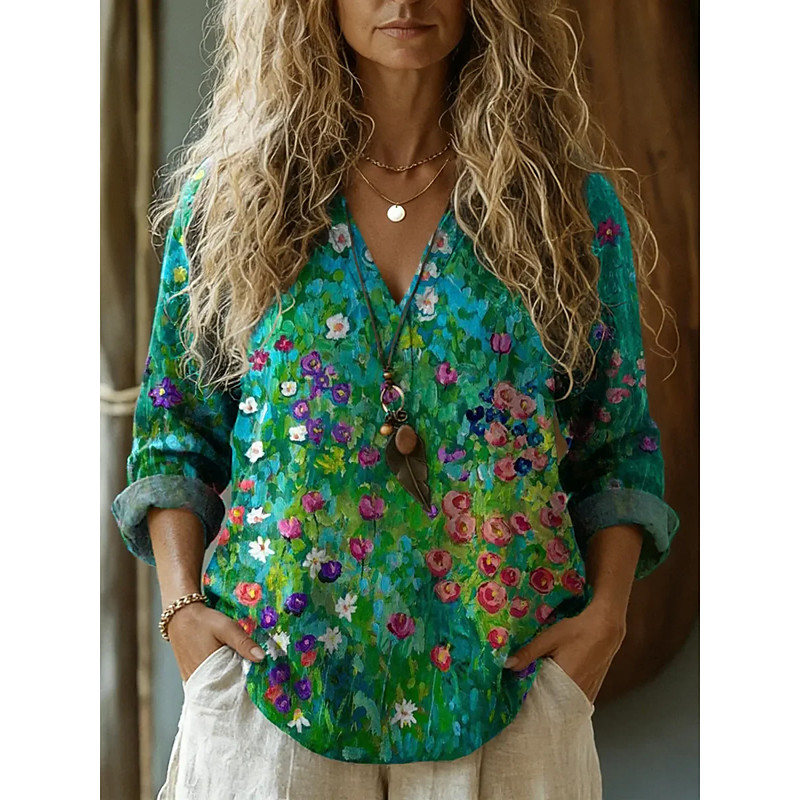 Women's Blouse Floral Graphic Vintage Daily Stylish Long Sleeve V Neck Long Tops Daily Holiday Print Green Khaki Summer Spring