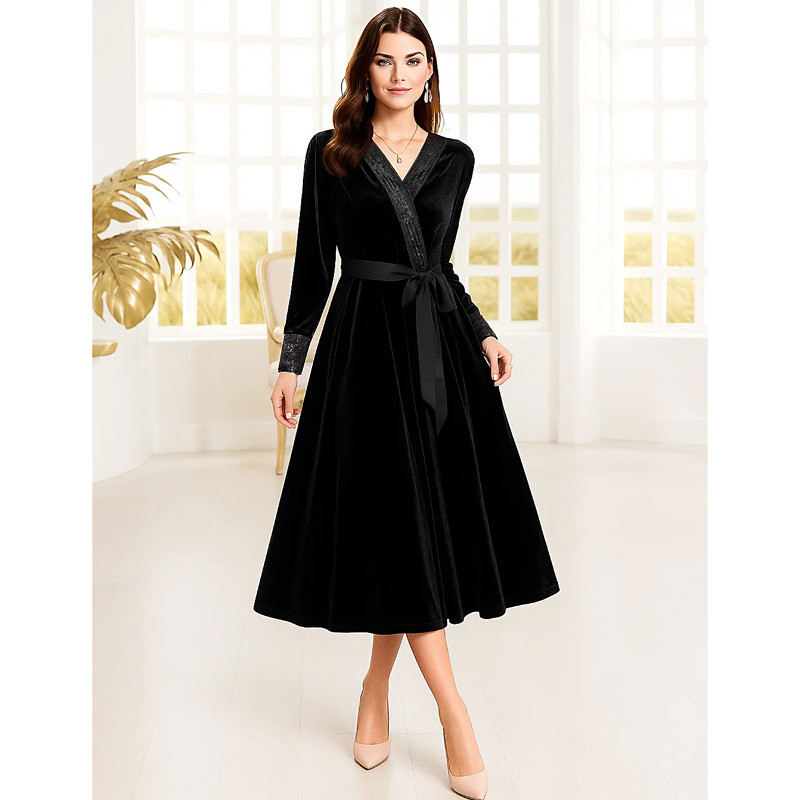 A-Line Tea Length Party Dress Cocktail Dress Wedding Guest Dress Mother of the Bride Dress Long Sleeve V Neck Elegant Vintage Luxurious Spandex Velvet with Beading