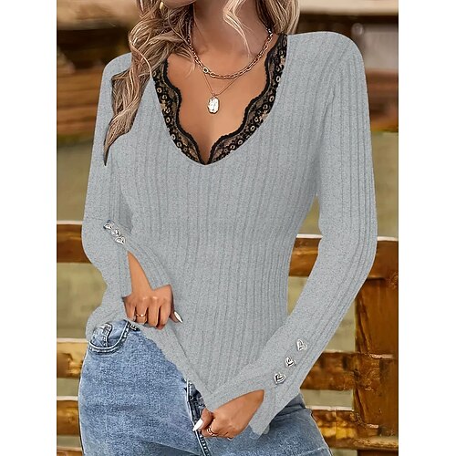 Per donna Top in pizzo Tinta unica Moda Manica lunga A V Top regolari Giornaliero Marrone Grigio Primavera