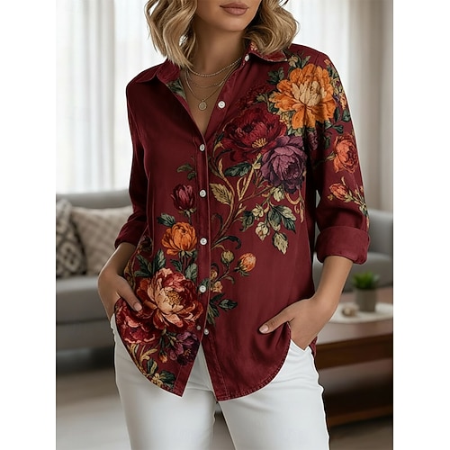 Per donna Maglietta Grafico Piante Tribale Vintage Elegante Classico Manica Lunga Scollo a V Top Regolari Quotidiano Stampato Blu Verde chiaro Vino Blu marino Fucsia Primavera Autunno Inverno