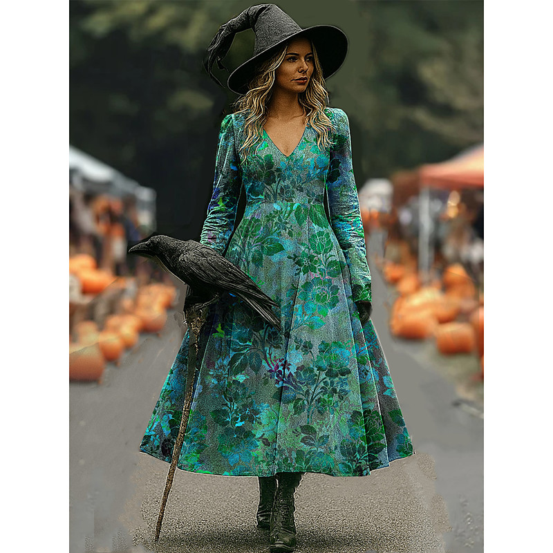 Women's Witch Print Maxi Dress A Line Dress Vacation Casual Boho Beach Regular Fit Floral Graphic Long Sleeve V Neck Red Blue Purple Orange Spring Fall