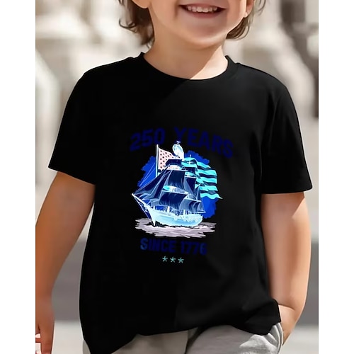 100% Cotone Bambini Ragazzi Nero Bianco Grafico Bandiera 250° anniversario Bandiera americana per bambini Maglietta Blusa Girocollo Manica Corta All'aperto Abbigliamento Quotidiano Moda Streetwear