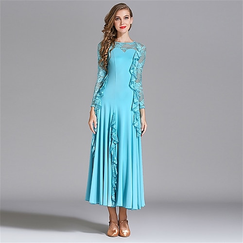 Abito da ballo da sala con dettagli in pizzo per donna - abito a trapezio a maniche lunghe con dettagli arricciati per competizioni, balli latini ed eventi di danza - azzurro
