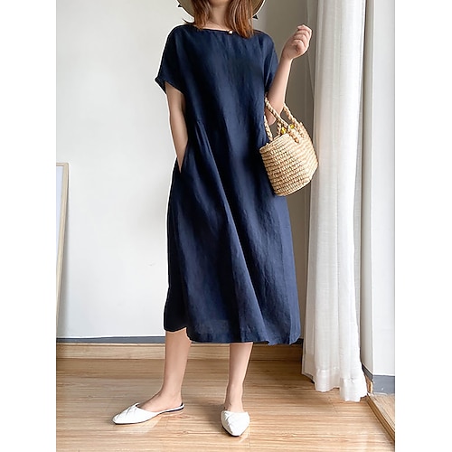 Per donna Abito Midi Finto cotone e lino Vestito Casual Elegante Moda Moderno Quotidiano All'aperto Vacanza Vestibilità comoda Semplice Manica Corta Girocollo Nero Bianco Rosso Blu marino Estate