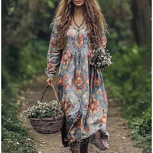 Per donna Abito lungo maxi Abito Boho Abito Vintage Vestito Casual Vintage Quotidiano All'aperto Vacanza Vestibilità comoda Floreale Manica Lunga Scollo a V Blu Primavera Autunno