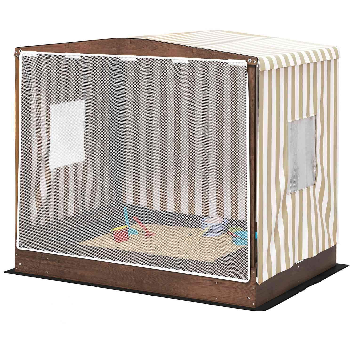 Sandkasse med baldakin og netdør, 142 x 101,5 cm træsandkasse med bænk, opbevaringsplads, gulvbeskyttelse, til 4 børn 3-6 år bru