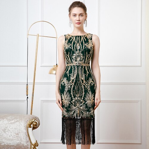 Retrò Vintage Anni Ruggenti Anni 1920 Lunghezza al ginocchio Abito Flapper Vestito Abiti Senza maniche Il grande Gatsby Invitato al matrimonio Paillettes Frangia con nappe Scollo Tondo Costume Per