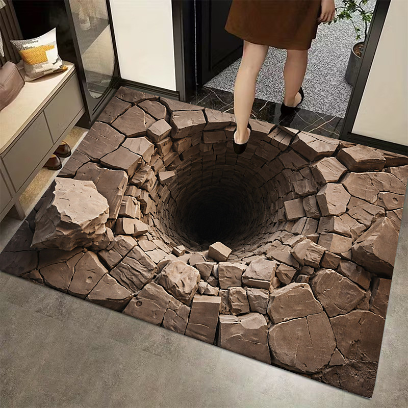 3D Optical Illusion Doormat Deep Hole with Cracked Stone Effect 2D Flat Print for an Impressive Entryway Statement Rug