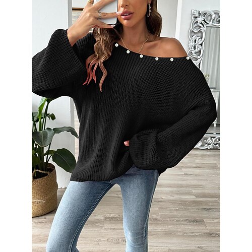 Per donna Felpa Casual Morbido Colore Puro A Coste Senza Spalle Lavorato a maglia Manica Lunga Top Regolari Maglia All'aperto Quotidiano Weekend Blu Nero Autunno Inverno