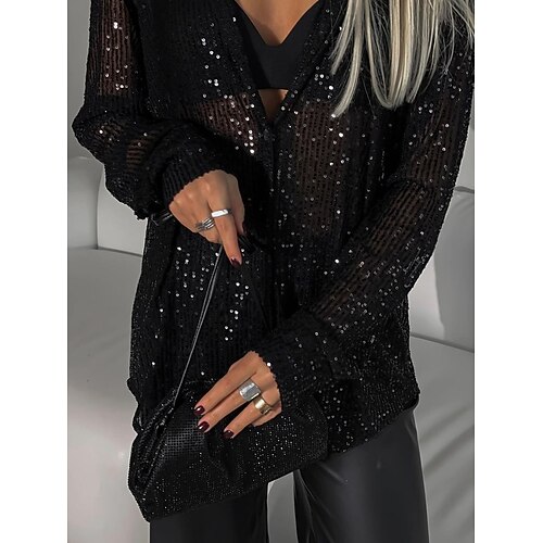Per donna Blusa Tinta unica Elegante Casual Manica Lunga Colletto a Camicia Top Regolari Quotidiano Paillettes Bottoni Verde salvia Nero Bianco Champagne Rosso Primavera Autunno Inverno