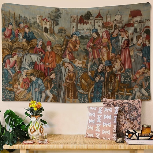 Scena di vita in un villaggio medievale, rinascimentale vintage, persone, castello, festa della vendemmia, arazzo da parete, arte gotica antica, da appendere per soggiorno, camera da letto,