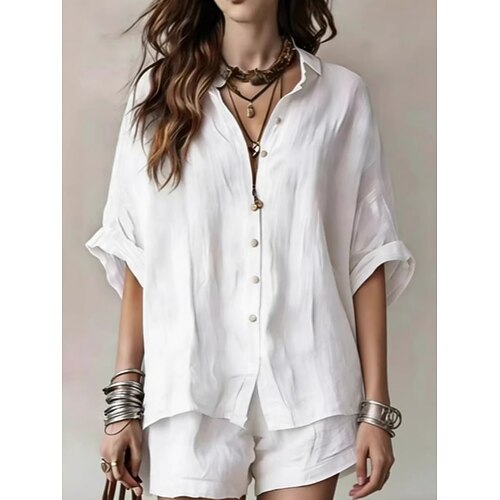 Per donna Set di Pantaloncini Manica Lunga Colletto a Camicia Tinta unica Moda Streetwear Casuale Quotidiano All'aperto Blu Nero Bianco Estate Vestibilità regolare