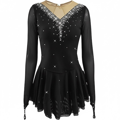 abito da pattinaggio artistico abito da pattinaggio sul ghiaccio da donna nero patchwork orlo asimmetrico elastico allenamento competizione pattinaggio abbigliamento manica lunga pattinaggio sul
